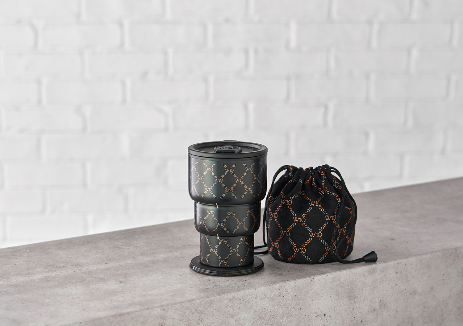 - 3 different types of double walled collapsible cups, that allow you to drink your coffee on the go, and then pack it away in your pouch for compact storage.